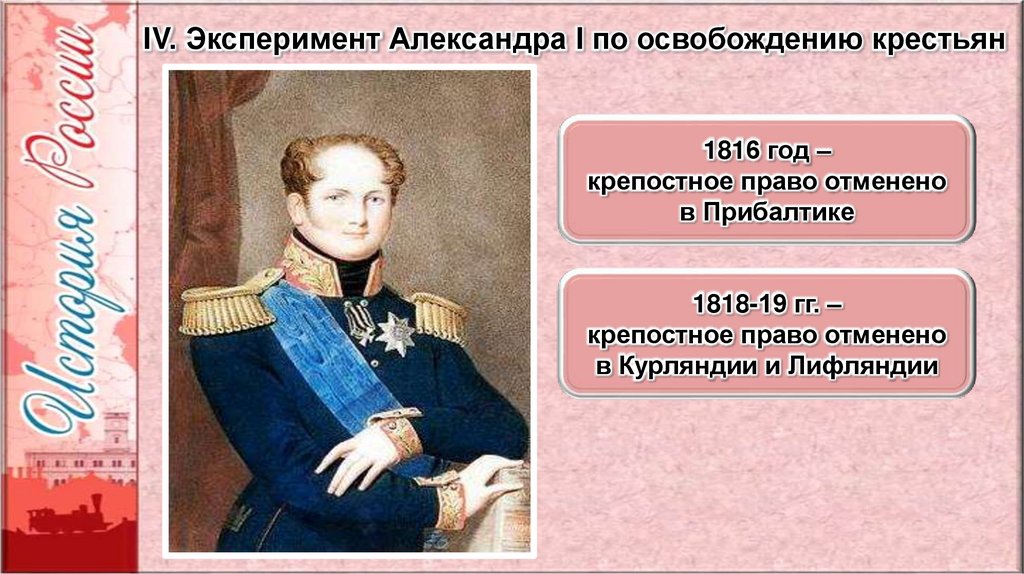 IV. Эксперимент Александра I по освобождению крестьян1816 год –
