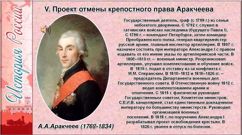 V. Проект отмены крепостного права АракчееваА.А.Аракчеев (1769-1834)