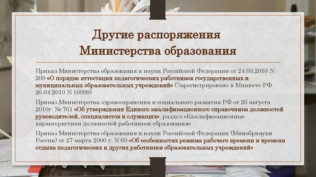 распоряжения Правительства РФ; Приказы, распоряжения Министерства