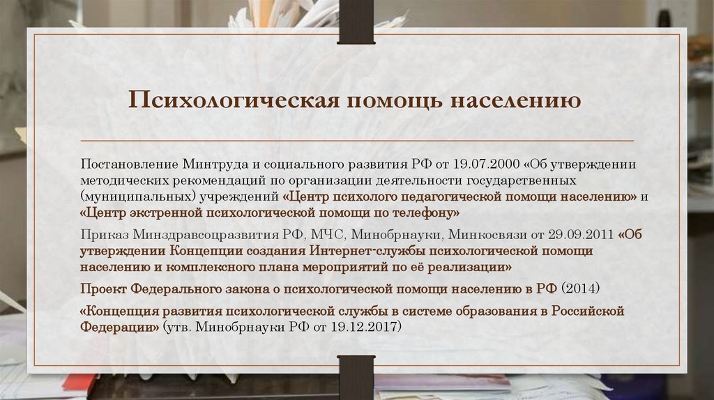 Психологическая помощь населениюПостановление Минтруда и социального развития РФ от 19.07.2000 «Об утверждении