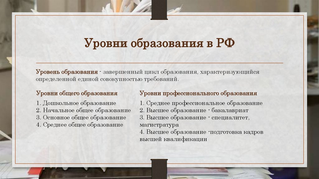 Уровни образования в РФУровень образования - завершенный цикл образования, характеризующийся