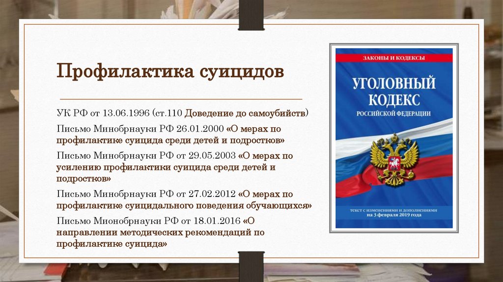 Профилактика суицидовУК РФ от 13.06.1996 (ст.110 Доведение до самоубийств)