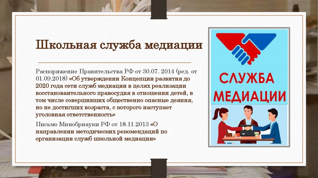 Школьная служба медиацииРаспоряжение Правительства РФ от 30.07. 2014 (ред. от