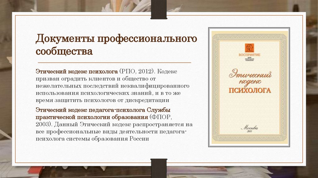 психологии образования (ФПОР, 2003); Этический кодекс психолога (РПО, 2012).
