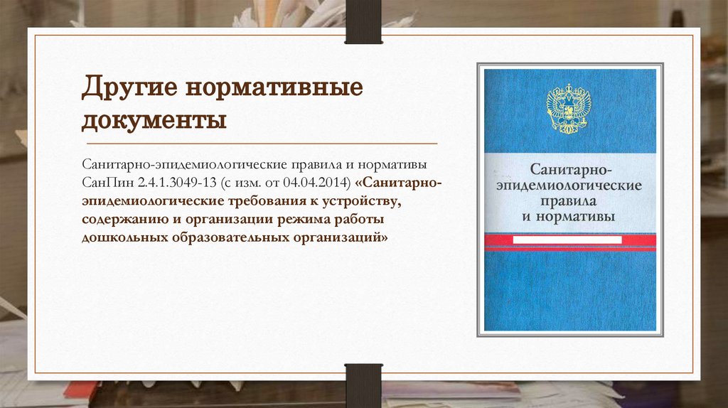 СанПин 2.4.1.3049-13 (с изм. от 04.04.2014) «Санитарноэпидемиологические требования к устройству,