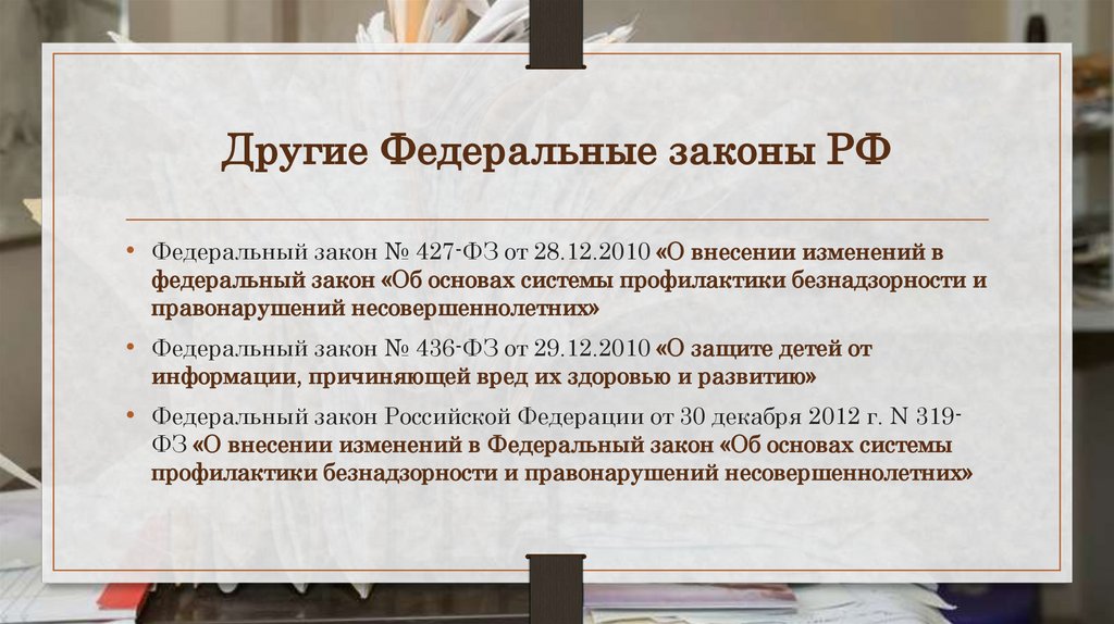 Другие Федеральные законы РФ• Федеральный закон № 427-ФЗ от 28.12.2010 «О внесении изменений в