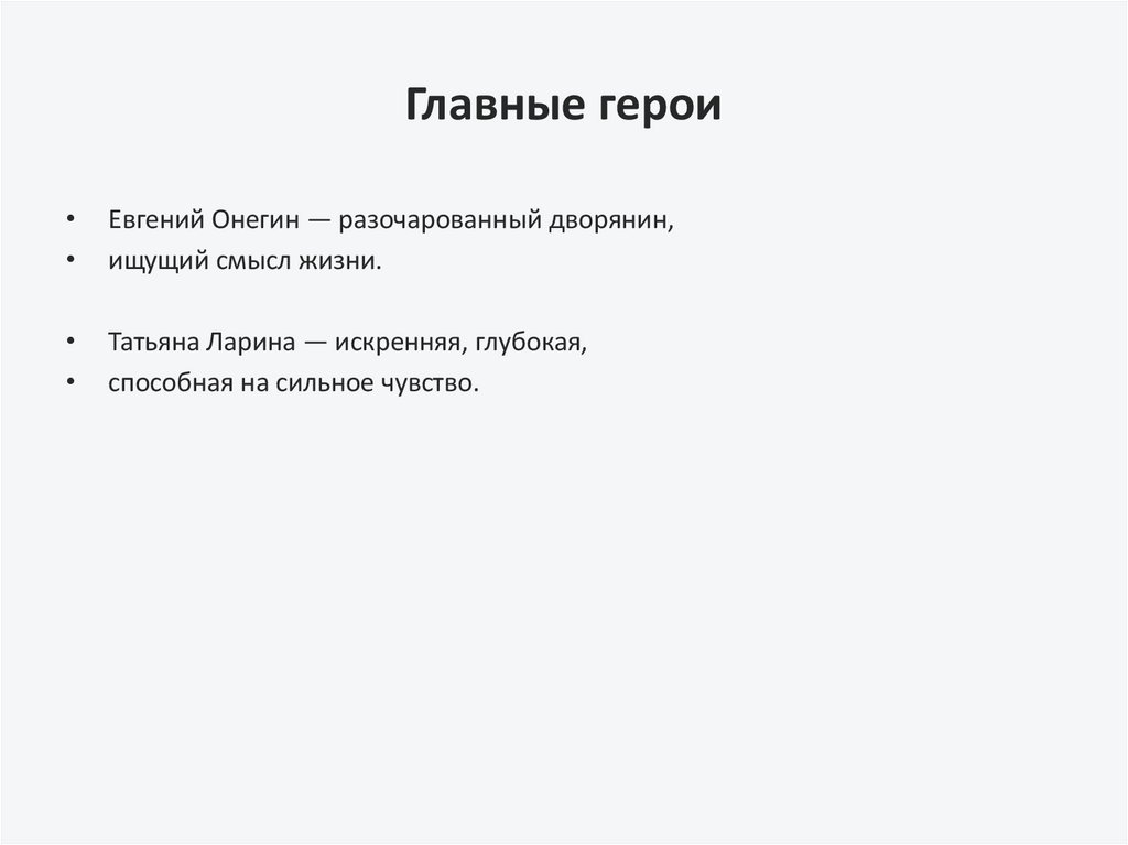 Главные героиЕвгений Онегин — разочарованный дворянин,