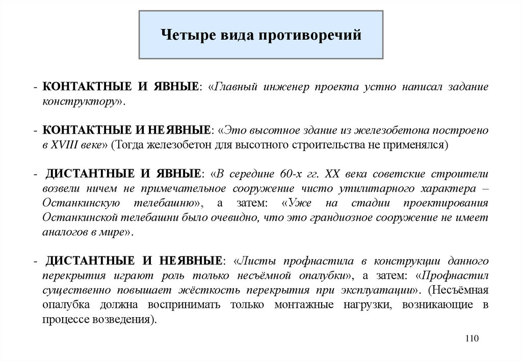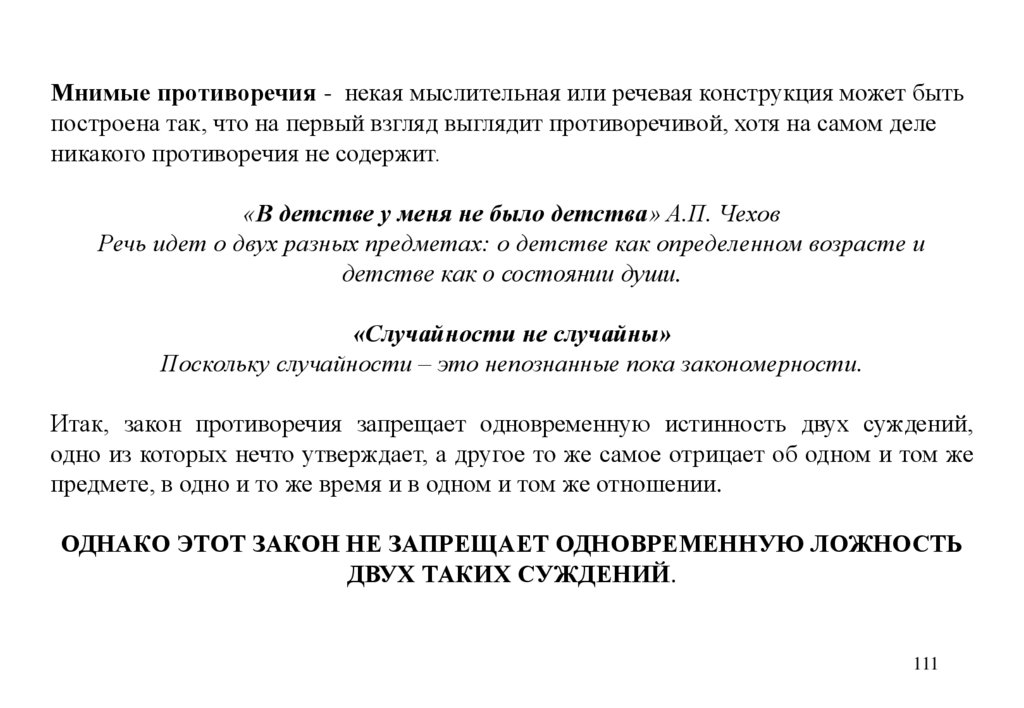 Мнимые противоречия - некая мыслительная или речевая конструкция может бытьпостроена так, что на первый взгляд выглядит противоречивой, хотя на самом деле