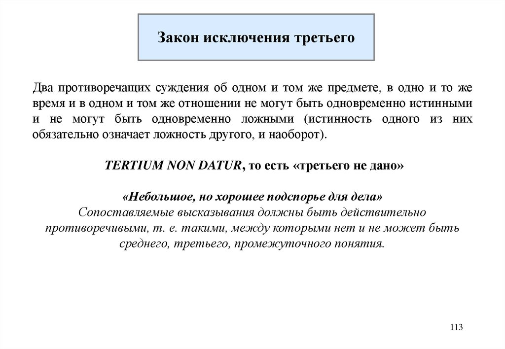 Закон исключения третьегоДва противоречащих суждения об одном и том же предмете, в одно и то же
