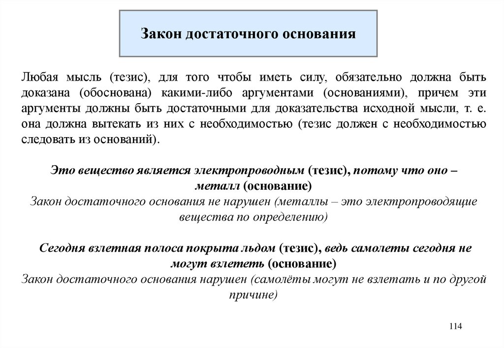 Закон достаточного основанияЛюбая мысль (тезис), для того чтобы иметь силу, обязательно должна быть