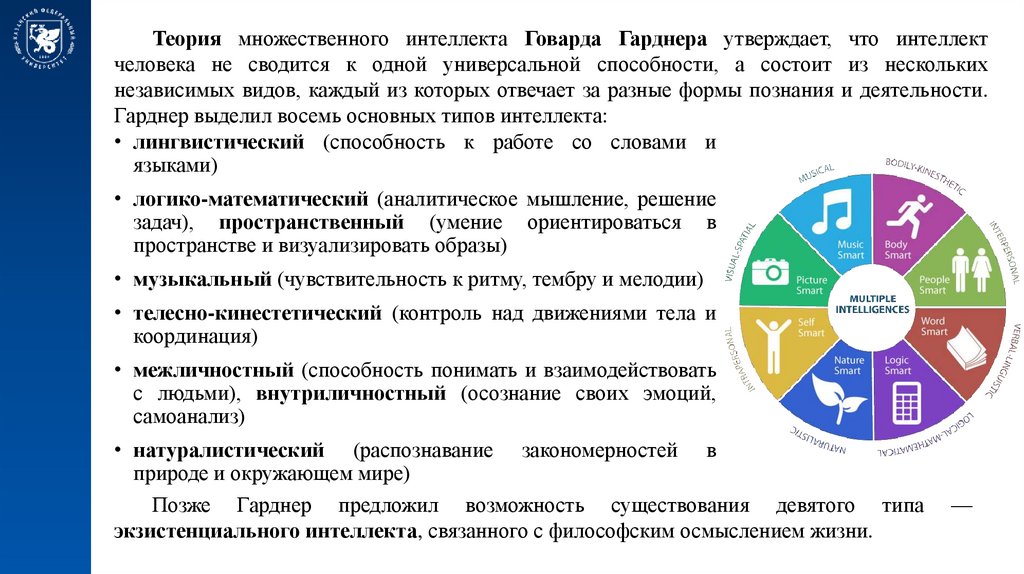 Теория множественного интеллекта Говарда Гарднера утверждает, что интеллектчеловека не сводится к одной универсальной способности, а состоит из нескольких