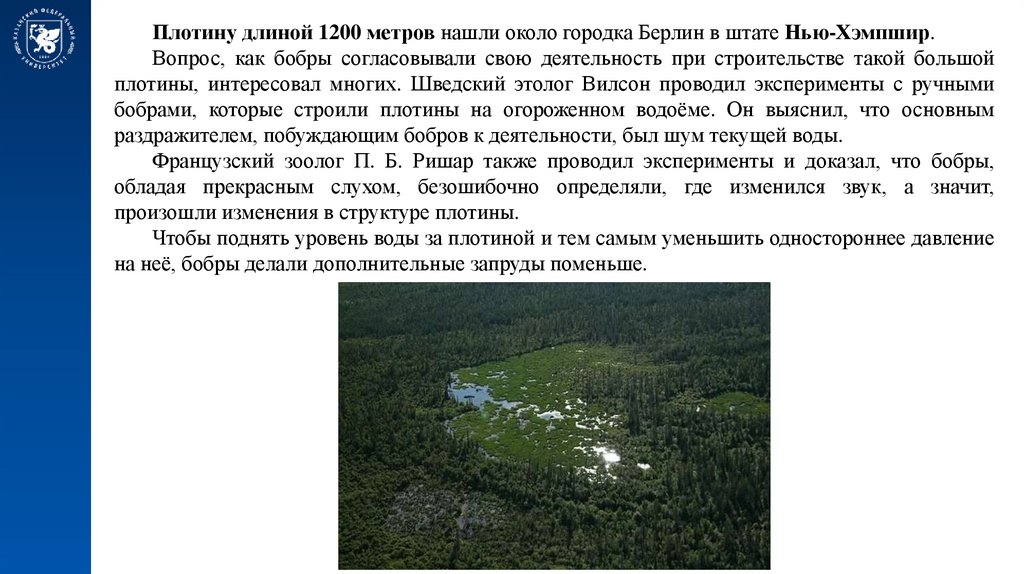 Плотину длиной 1200 метров нашли около городка Берлин в штате Нью-Хэмпшир.Вопрос, как бобры согласовывали свою деятельность при строительстве такой большой
