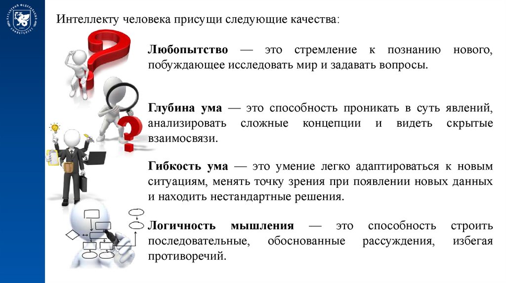 Интеллекту человека присущи следующие качества:Любопытство — это стремление к познанию нового,