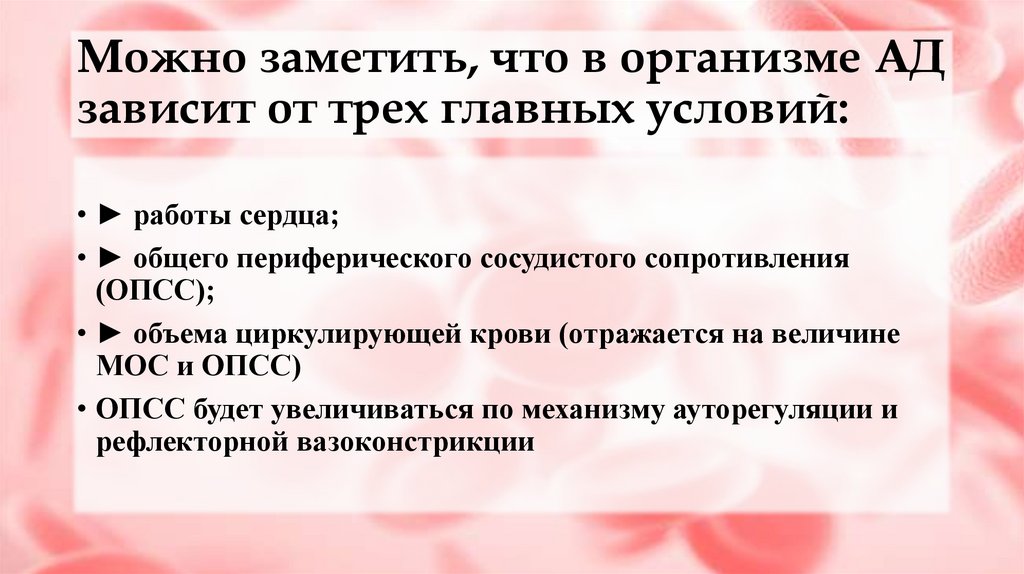 Можно заметить, что в организме АДзависит от трех главных условий: