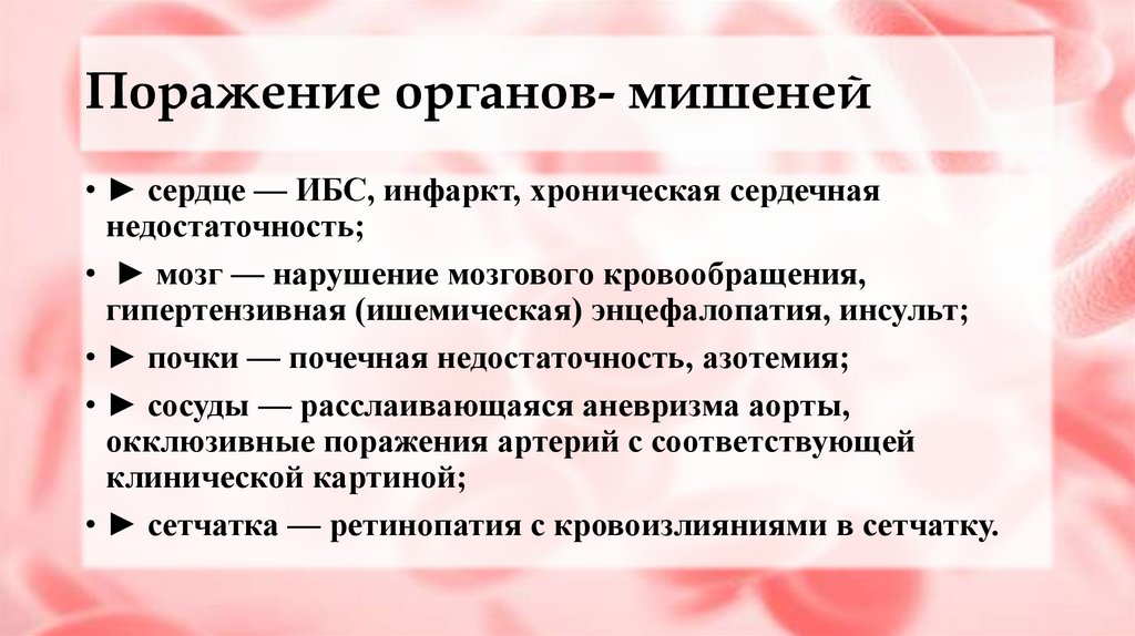 Поражение органов- мишеней• ► сердце — ИБС, инфаркт, хроническая сердечная