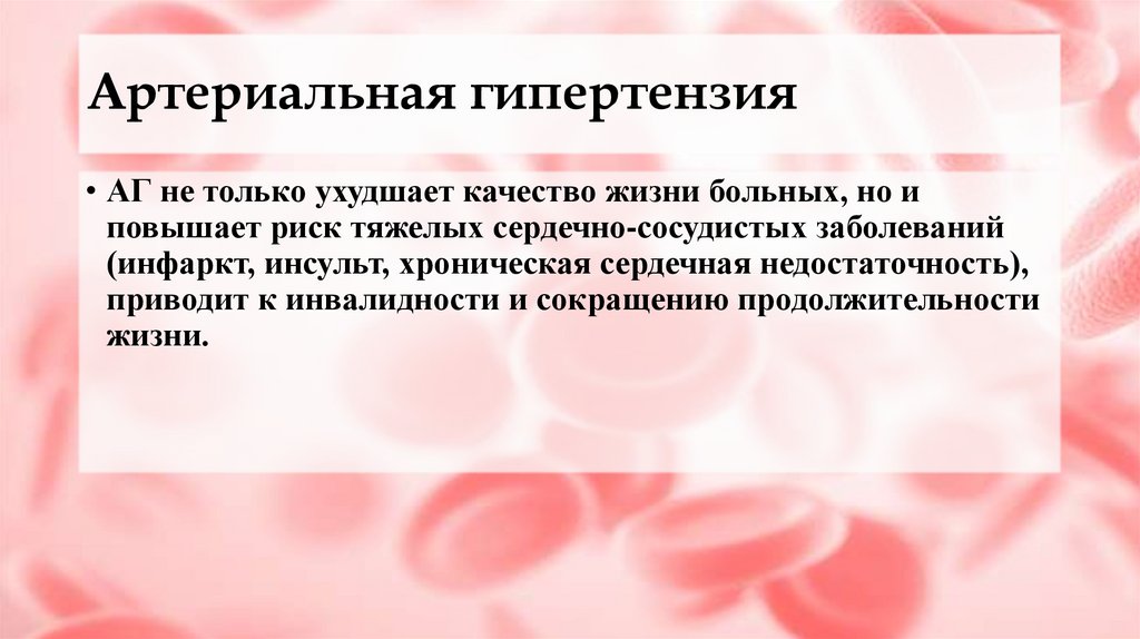 Артериальная гипертензия• АГ не только ухудшает качество жизни больных, но и