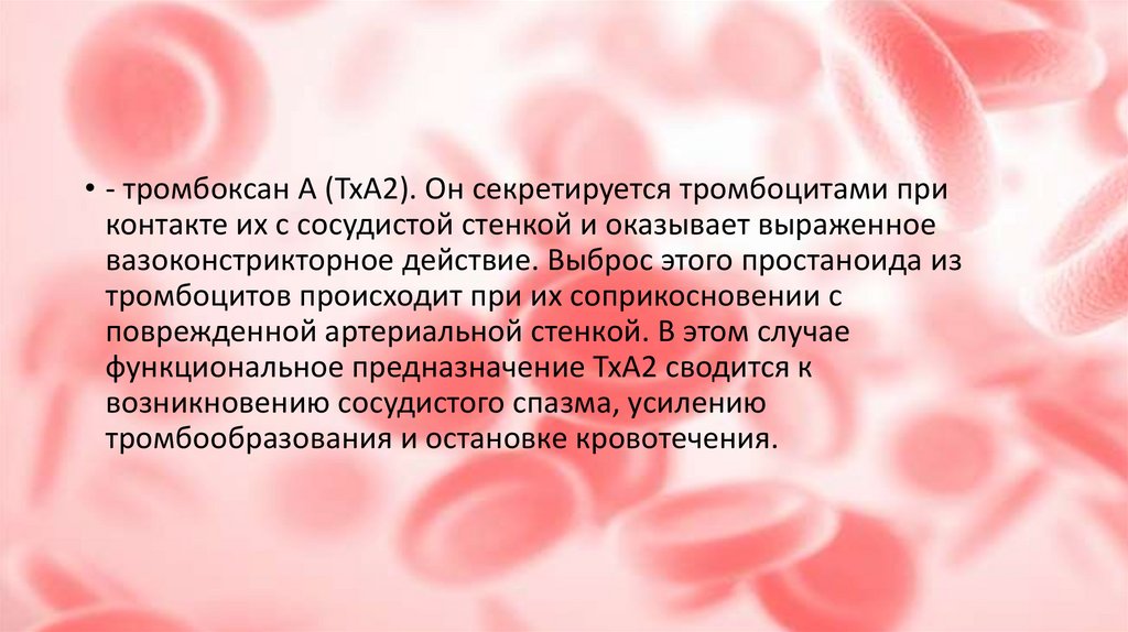 • - тромбоксан А (ТхА2). Он секретируется тромбоцитами приконтакте их с сосудистой стенкой и оказывает выраженное
