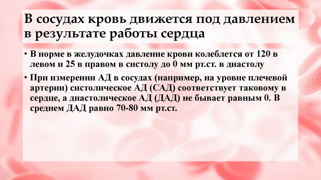 В сосудах кровь движется под давлениемв результате работы сердца