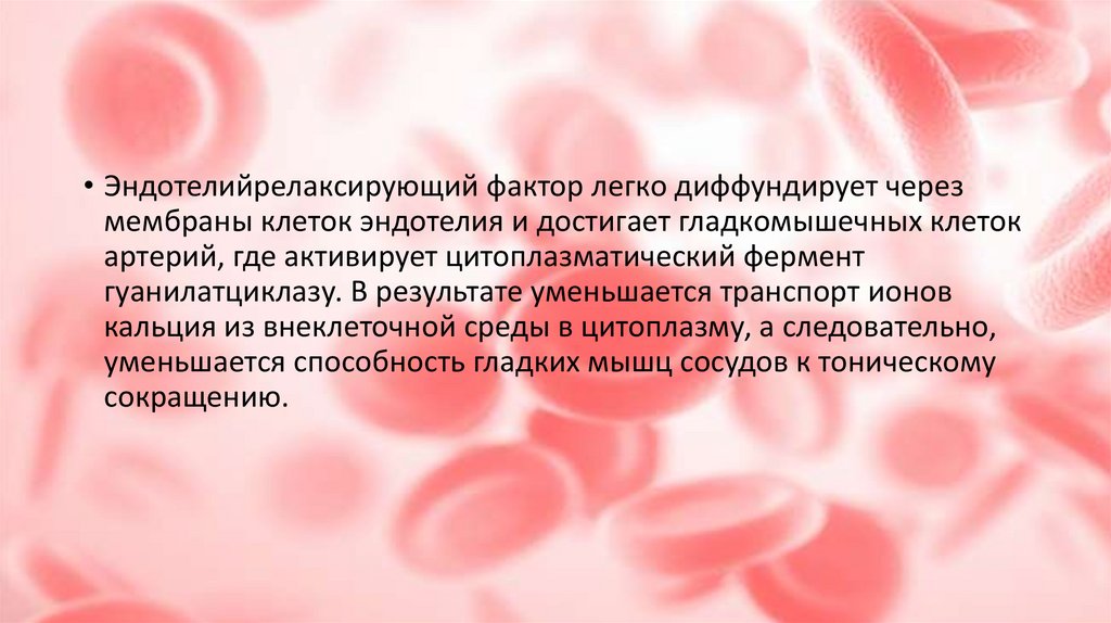 • Эндотелийрелаксирующий фактор легко диффундирует черезмембраны клеток эндотелия и достигает гладкомышечных клеток