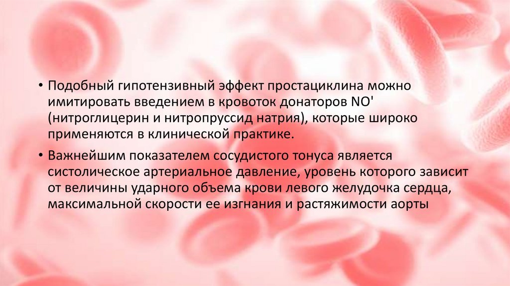 • Подобный гипотензивный эффект простациклина можноимитировать введением в кровоток донаторов NO'