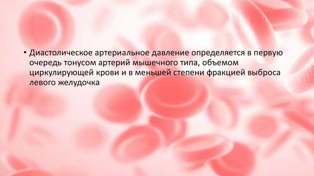 • Диастолическое артериальное давление определяется в первуюочередь тонусом артерий мышечного типа, объемом