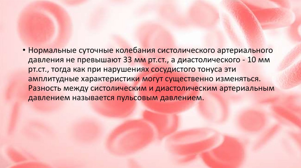 • Нормальные суточные колебания систолического артериальногодавления не превышают 33 мм рт.ст., а диастолического - 10 мм