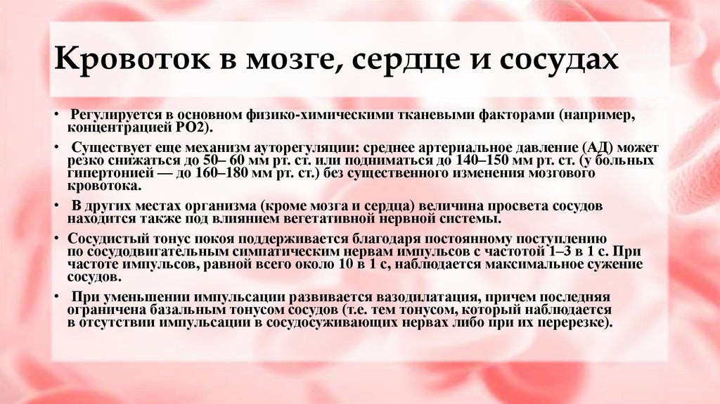 Кровоток в мозге, сердце и сосудах• Регулируется в основном физико-химическими тканевыми факторами (например,