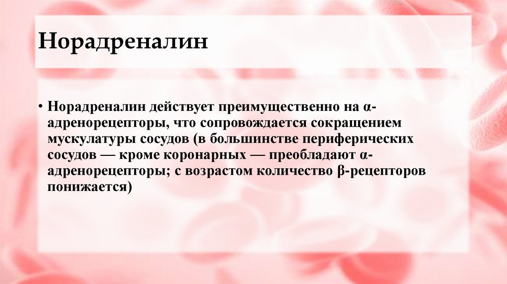Норадреналин• Норадреналин действует преимущественно на αадренорецепторы, что сопровождается сокращением