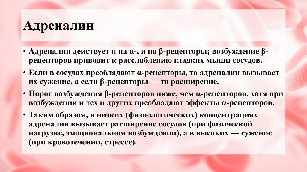 Адреналин• Адреналин действует и на α-, и на β-рецепторы; возбуждение βрецепторов приводит к расслаблению гладких мышц сосудов.