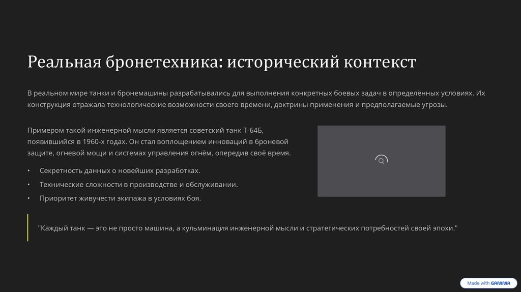 "Каждый танк — это не просто машина, а кульминация инженерной мысли и стратегических потребностей своей эпохи."