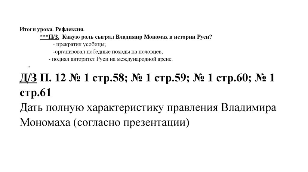 Итоги урока. Рефлексия.***П/З. Какую роль сыграл Владимир Мономах в истории Руси?