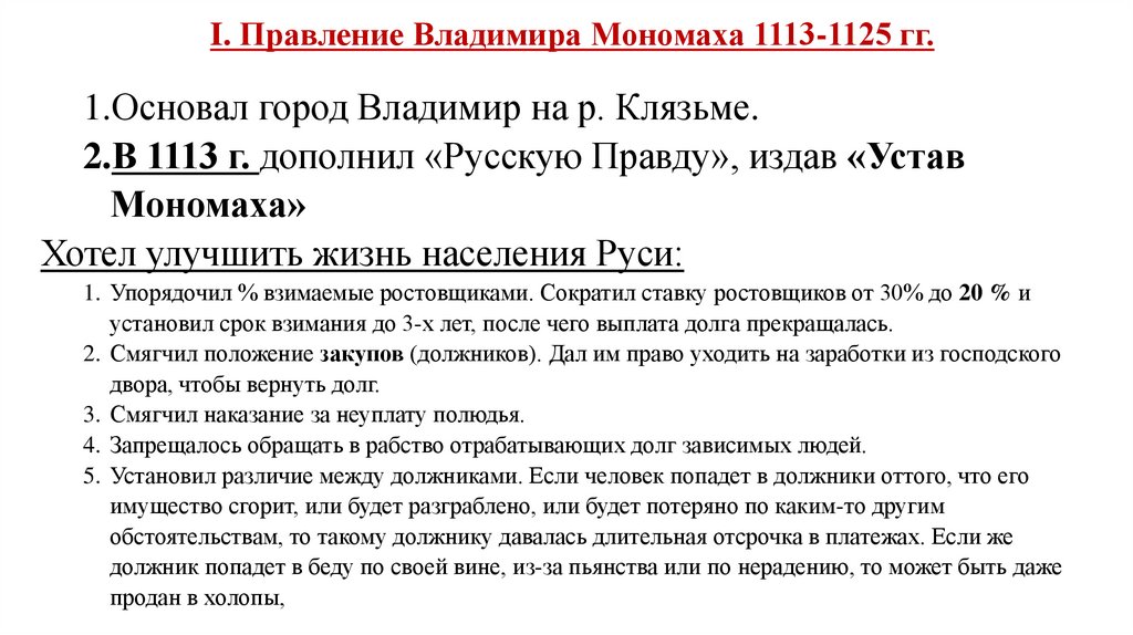 I. Правление Владимира Мономаха 1113-1125 гг.1.Основал город Владимир на р. Клязьме.