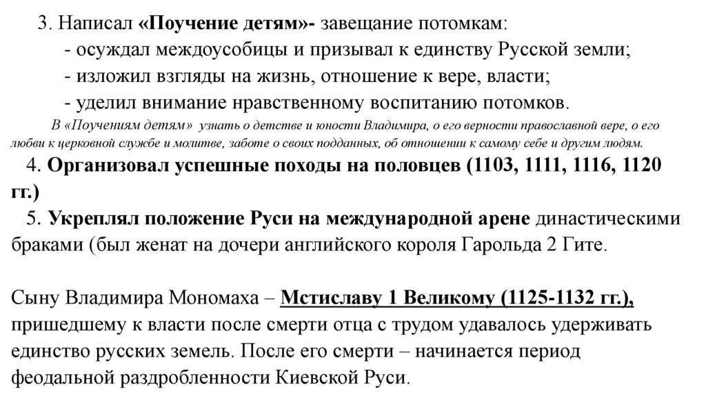 3. Написал «Поучение детям»- завещание потомкам:- осуждал междоусобицы и призывал к единству Русской земли;