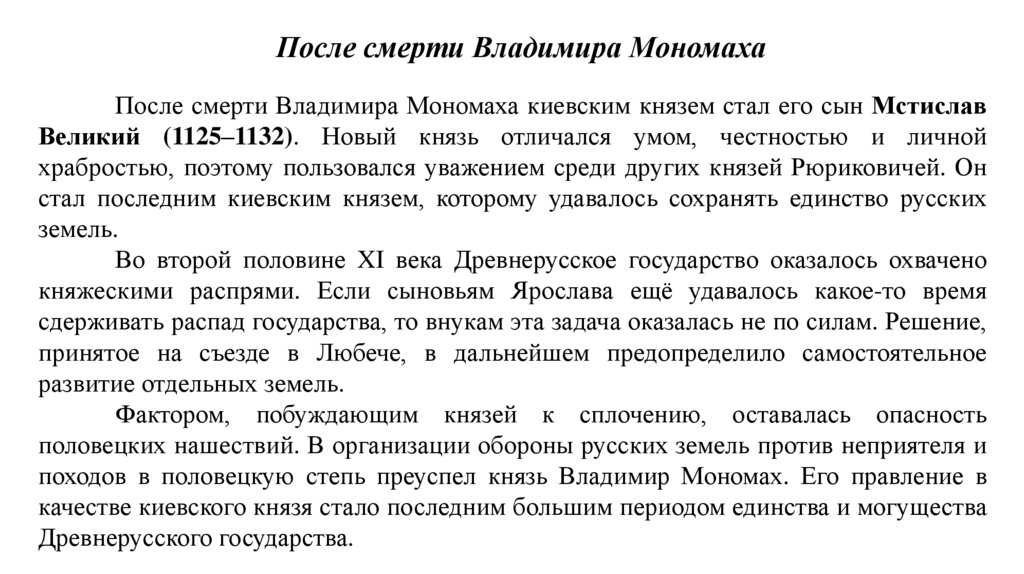 После смерти Владимира МономахаПосле смерти Владимира Мономаха киевским князем стал его сын Мстислав
