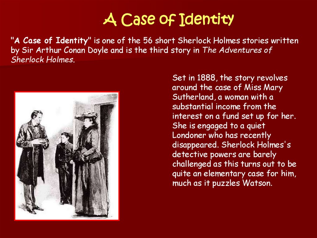 A Case of Identity"A Case of Identity" is one of the 56 short Sherlock Holmes stories written