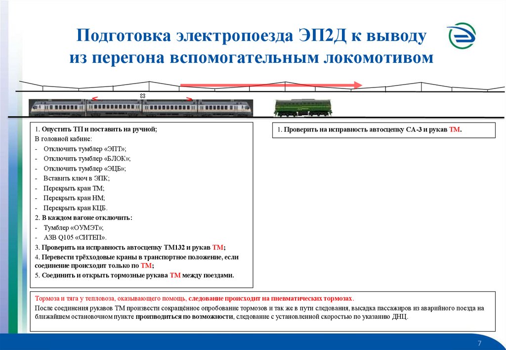 Подготовка электропоезда ЭП2Д к выводуиз перегона вспомогательным локомотивом