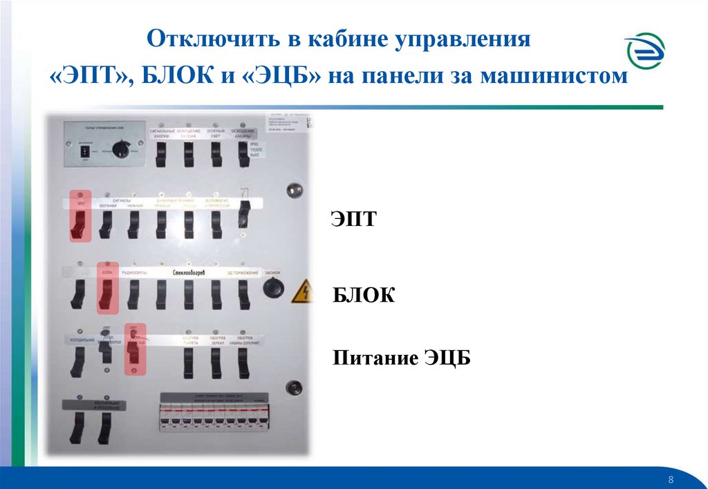 Отключить в кабине управления«ЭПТ», БЛОК и «ЭЦБ» на панели за машинистом
