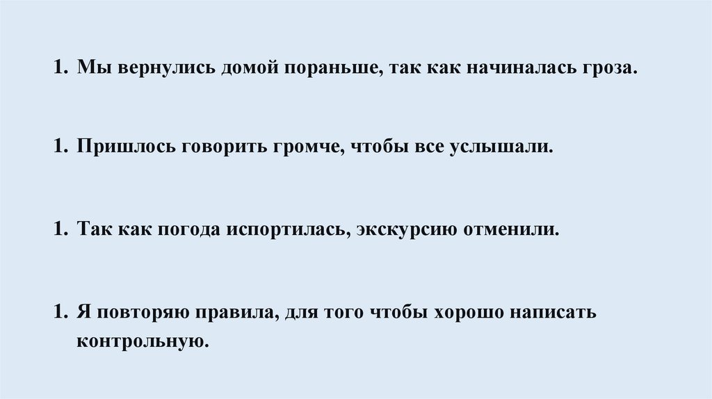 1. Мы вернулись домой пораньше, так как начиналась гроза.1. Пришлось говорить громче, чтобы все услышали.