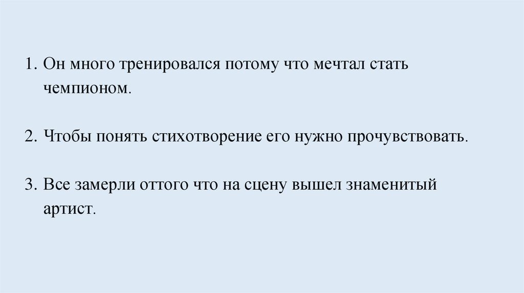 1. Он много тренировался потому что мечтал статьчемпионом.