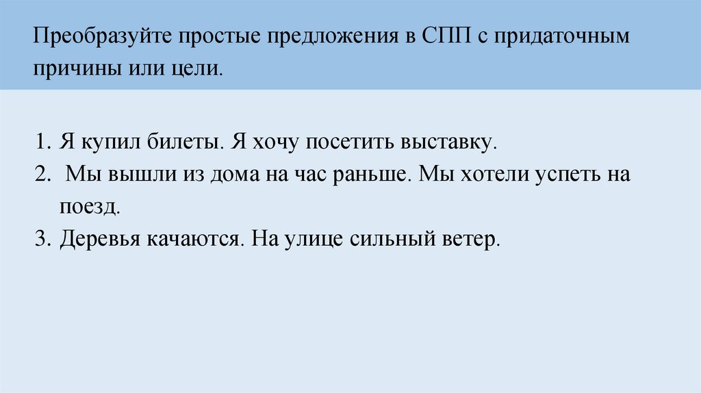 Преобразуйте простые предложения в СПП с придаточнымпричины или цели.