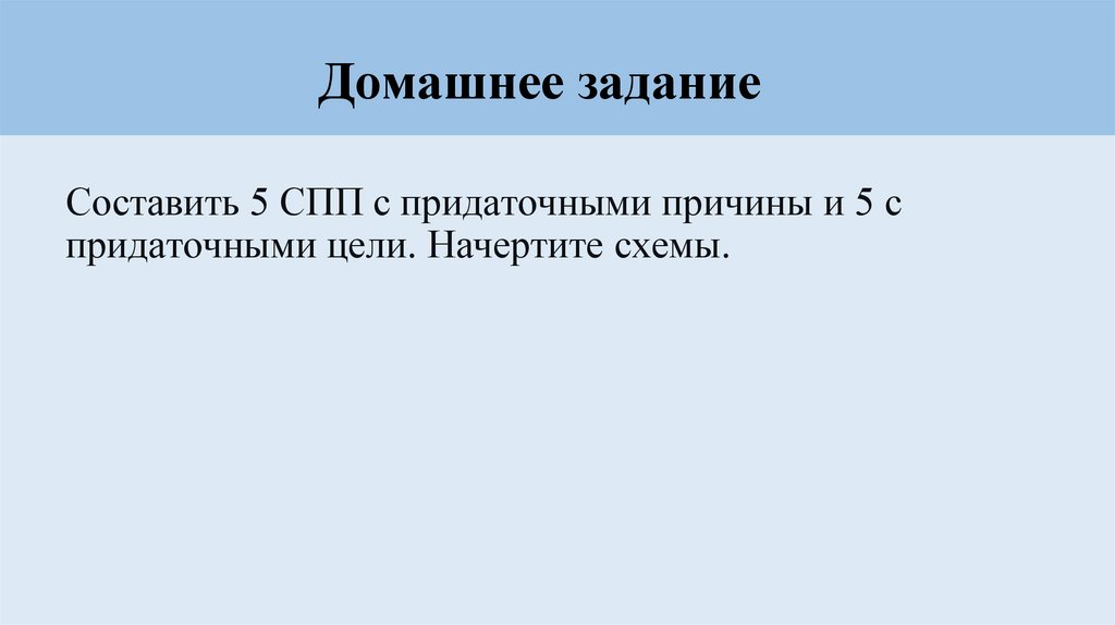 Домашнее заданиеСоставить 5 СПП с придаточными причины и 5 с