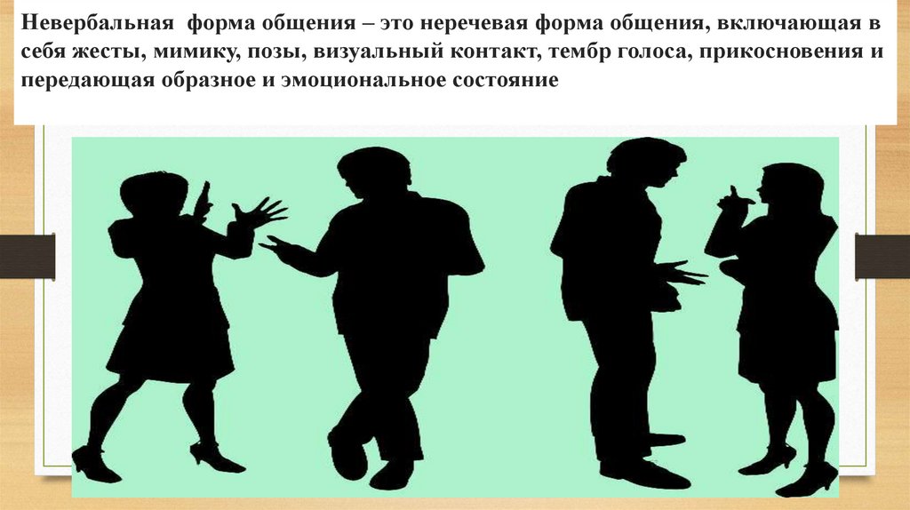 Невербальная форма общения – это неречевая форма общения, включающая всебя жесты, мимику, позы, визуальный контакт, тембр голоса, прикосновения и