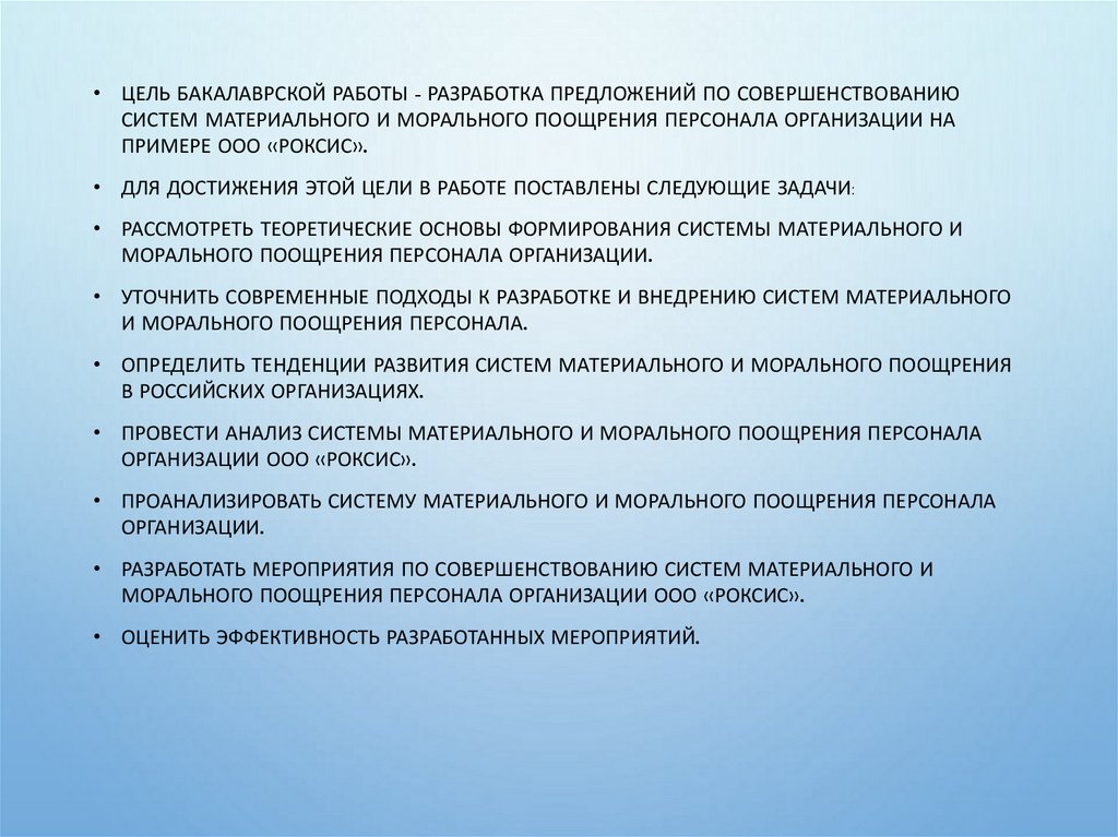 • ЦЕЛЬ БАКАЛАВРСКОЙ РАБОТЫ - РАЗРАБОТКА ПРЕДЛОЖЕНИЙ ПО СОВЕРШЕНСТВОВАНИЮСИСТЕМ МАТЕРИАЛЬНОГО И МОРАЛЬНОГО ПООЩРЕНИЯ ПЕРСОНАЛА ОРГАНИЗАЦИИ НА