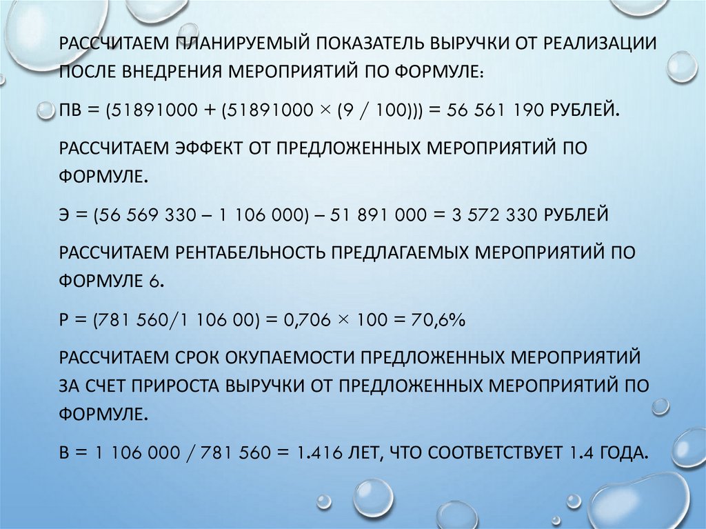 РАССЧИТАЕМ ПЛАНИРУЕМЫЙ ПОКАЗАТЕЛЬ ВЫРУЧКИ ОТ РЕАЛИЗАЦИИПОСЛЕ ВНЕДРЕНИЯ МЕРОПРИЯТИЙ ПО ФОРМУЛЕ: