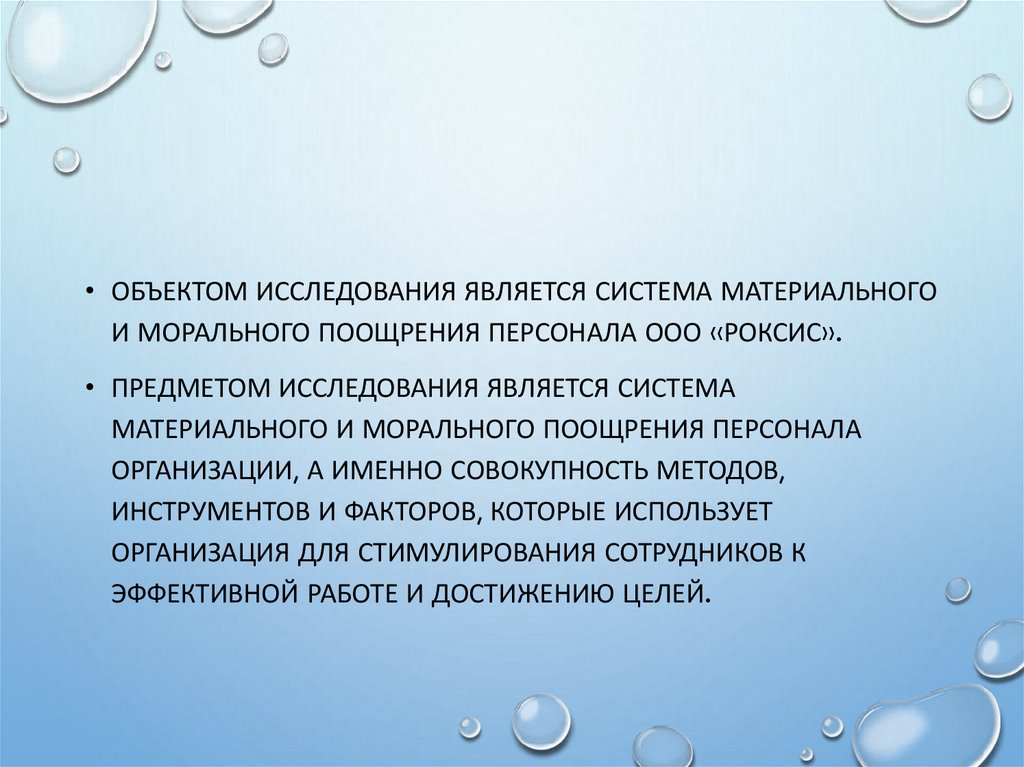 • ОБЪЕКТОМ ИССЛЕДОВАНИЯ ЯВЛЯЕТСЯ СИСТЕМА МАТЕРИАЛЬНОГОИ МОРАЛЬНОГО ПООЩРЕНИЯ ПЕРСОНАЛА ООО «РОКСИС».