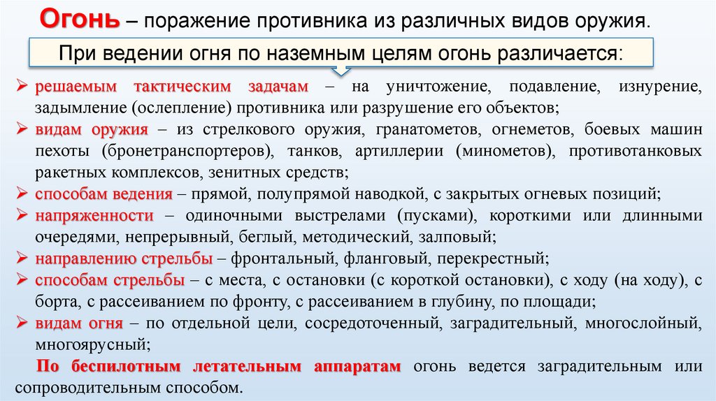 видам огня – по отдельной цели, сосредоточенный, заградительный, многослойный,