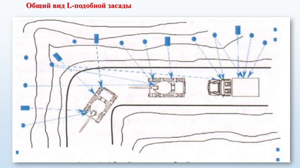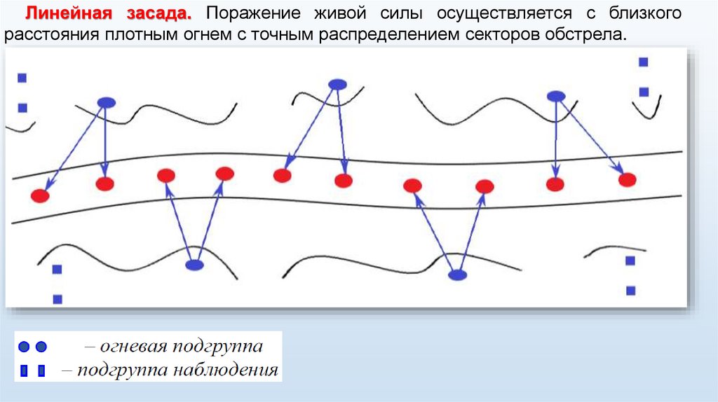Линейная засада. Поражение живой силы осуществляется с близкогорасстояния плотным огнем с точным распределением секторов обстрела.