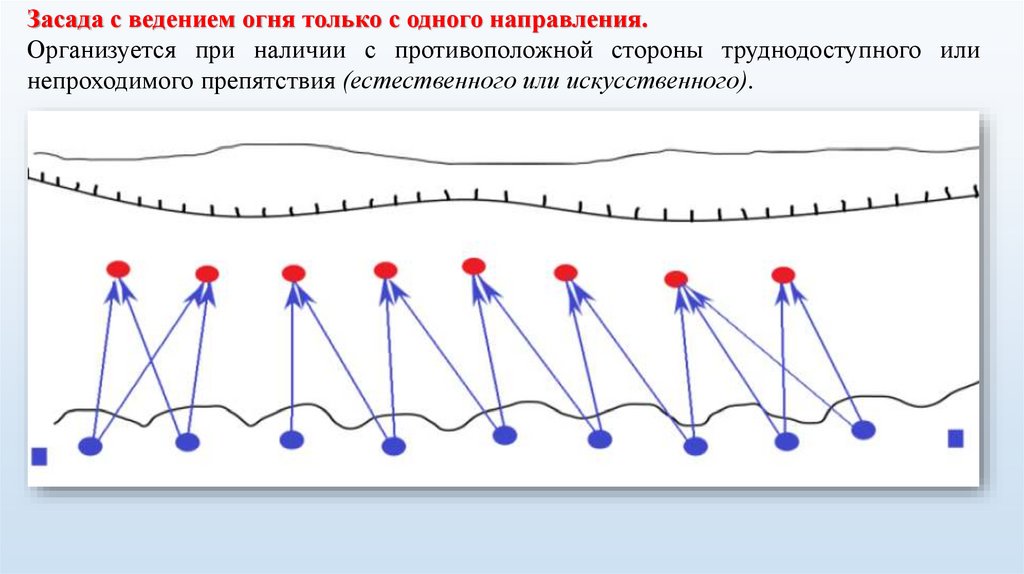 Засада с ведением огня только с одного направления.Организуется при наличии с противоположной стороны труднодоступного или