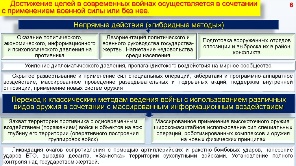Достижение целей в современных войнах осуществляется в сочетаниис применением военной силы или без нее.