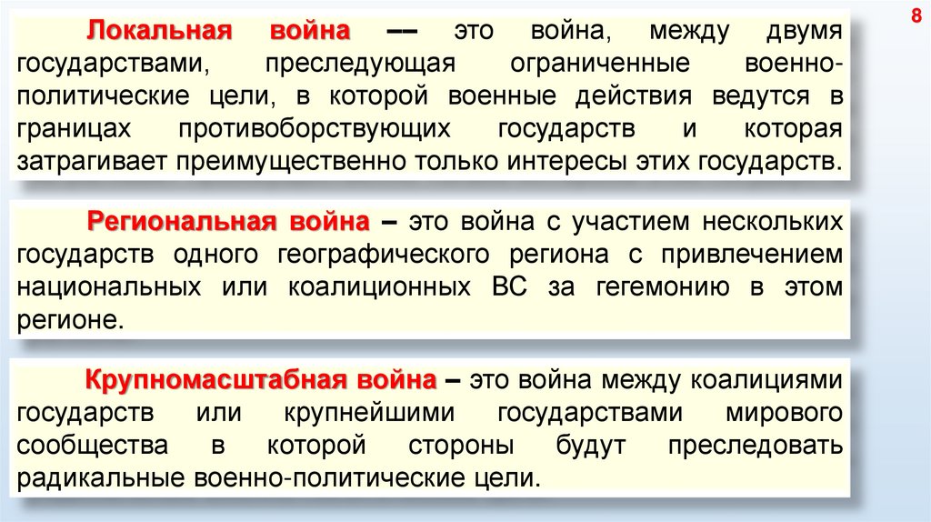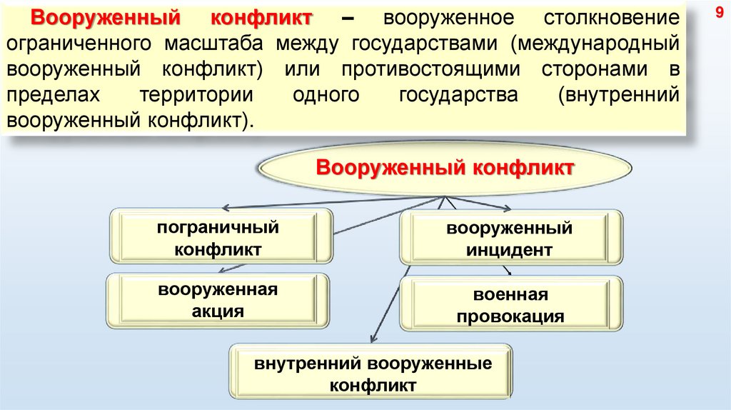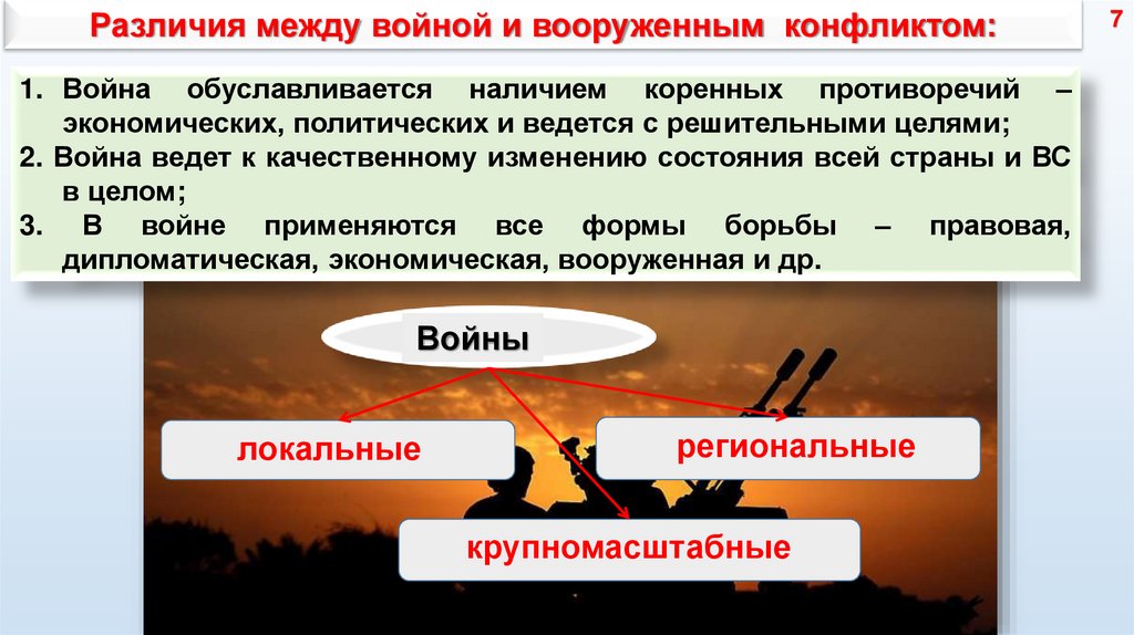 Различия между войной и вооруженным конфликтом:1. Война обуславливается наличием коренных противоречий –